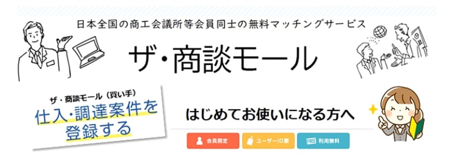 インターネット上に設けた取引先探しの場です。 数多くの商談会・見本市、異業種交流会を開催してきた商工会議所等が、それらのノウハウを使って運営しています。会員は無料で利用でき、簡易ホームページ作成などお得な機能が利用可能です。